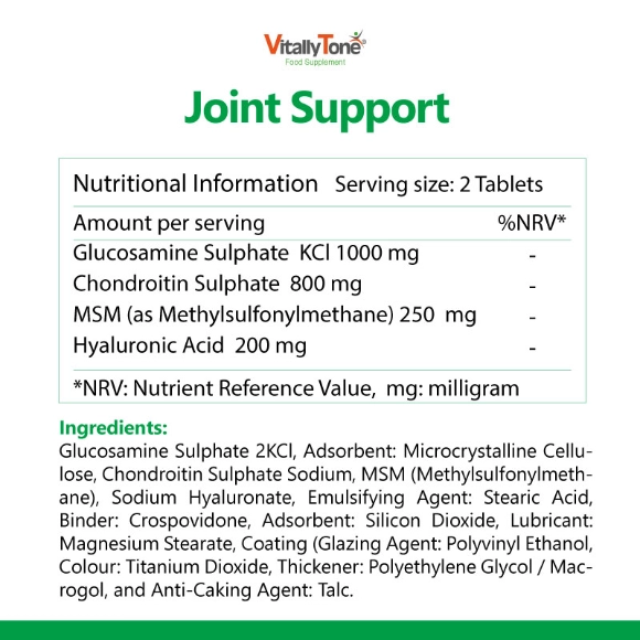 قرص جوینت ساپورت از برند ویتالی تون، حاوی گلوکزآمین، کندروئتین به همراه MSM( متیل سولفونیل متان) و هیالورونیک اسید جهت بهبود درد، التهاب و تسهیل حرکت مفاصل می باشد. جوینت ساپورت به بهبود علائم آرتروز، کاهش درد و التهاب مفاصل، افزایش انعطاف پذیری و کاهش خشکی مفاصل و پیشگیری از آسیب مفاصل در ورزشکاران کمک می کند. جوینت ساپورت دارای تاییدیه GMP نمایانگر تولید فرآورده در شرایط استاندارد و کیفیت مناسب می باشد.