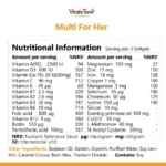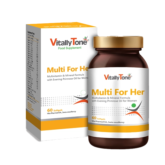 سافت ژل مولتی فور هر از برند ویتالی تون، مکمل تغذیه ای مختص زنان و حاوی 26 ماده مغذی ضروری شامل ویتامین ها و مینرال ها،آنتی اکسیدان ها ی قوی و روغن گل مغربی جهت تامین نیازهای روزانه می باشد. این مکمل منحصراً برای خانم ها فرموله شده است و مصرف آن به کاهش علائم سندروم پیش از قاعدگی (PMS) و پیشگیری از کم خونی، حفظ سلامت و شادابی پوست و مو، تقویت سیستم ایمنی، تامین انرژی و رفع احساس کسالت، کمک می نماید. مولتی فور هر، دارای تاییدیه GMP نمایانگر تولید فرآورده در شرایط استاندارد و کیفیت مناسب می باشد.